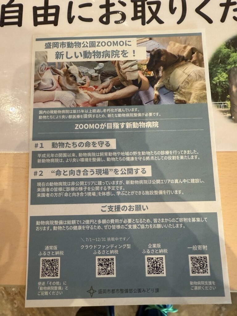 もう一周したんですが、小雨などであまり写真は撮れなかったものの、見落としていた場所などを見て回りました。この時「ZOOMOに動物病院を設けたい」というクラウドファンディングをしていましたので、その建設予定地なども少しだけ見ていきました。ふるさと納税やZOOMOへの直接寄付などでも受け付けていましたが、そのような動物の福祉に関する寄付はあらゆるところで行われているので、ぜひ検索してみてくださいね。