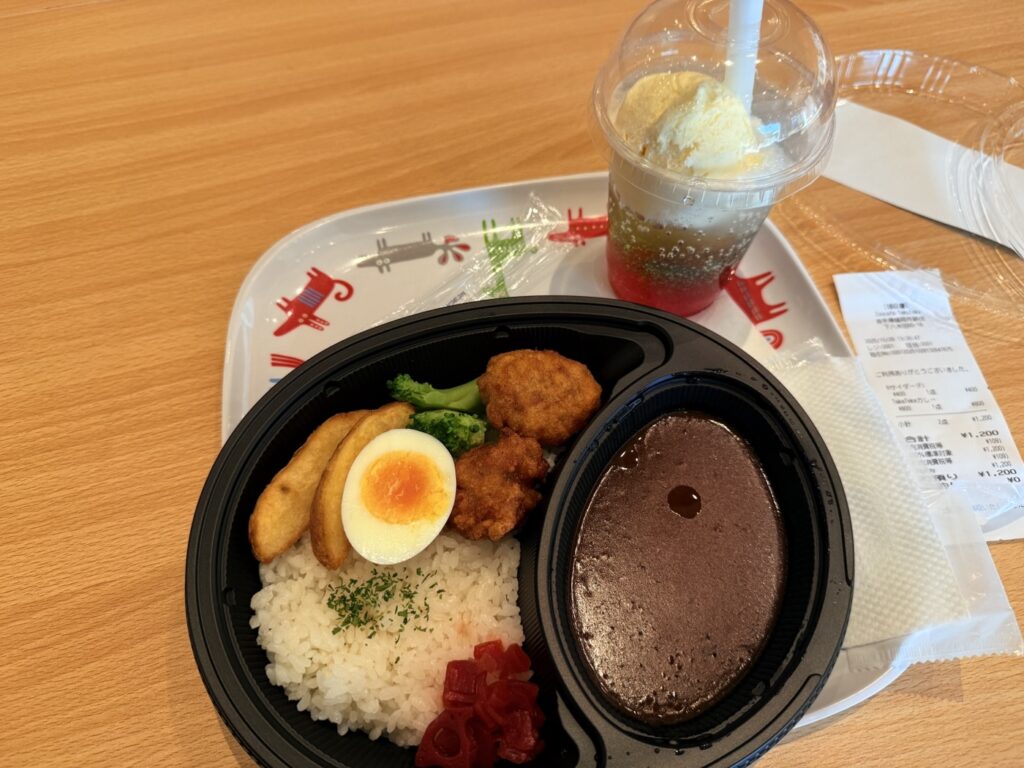 わんぱくピューマTeku Teku カレーという、おこさまランチ感あるカレーと、名前をド忘れしたサイダー(フロートのアイスをトッピング)です。おいしかった。